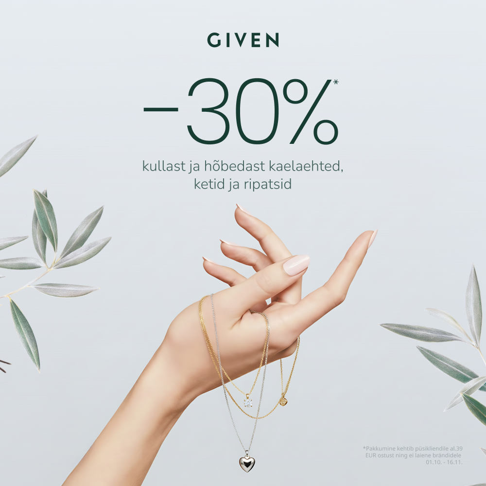 2. Valik kullast ja hõbedast kaelaehted, ketid ja ripatsid –30% Periood: 01.10.–16.11.2025.