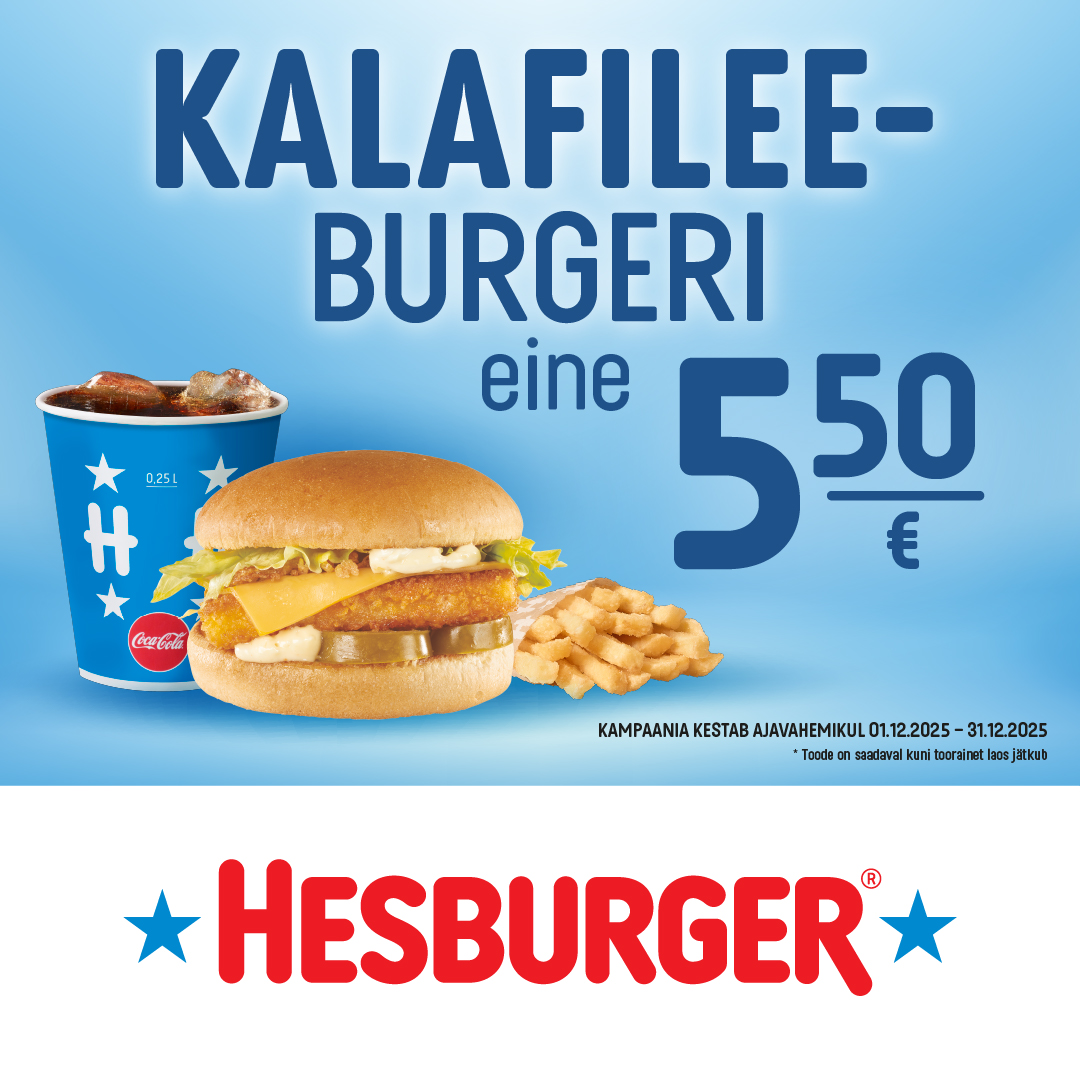 Hesburgeri detsembrikuu pakkumine Kuupakkumine Hesburgeris! Kalafileeburger 2,90 € Kalafileeburgeri eine 5,50 € Kalafileeburgeri suur eine 6,70 € Pakkumine kehtib 01.12.2025 – 31.12.2025. Project detailsMeeldimisi:0Kuupäev:detsember 1, 2025november 27, 2025Teema:Toit & Toitlustus